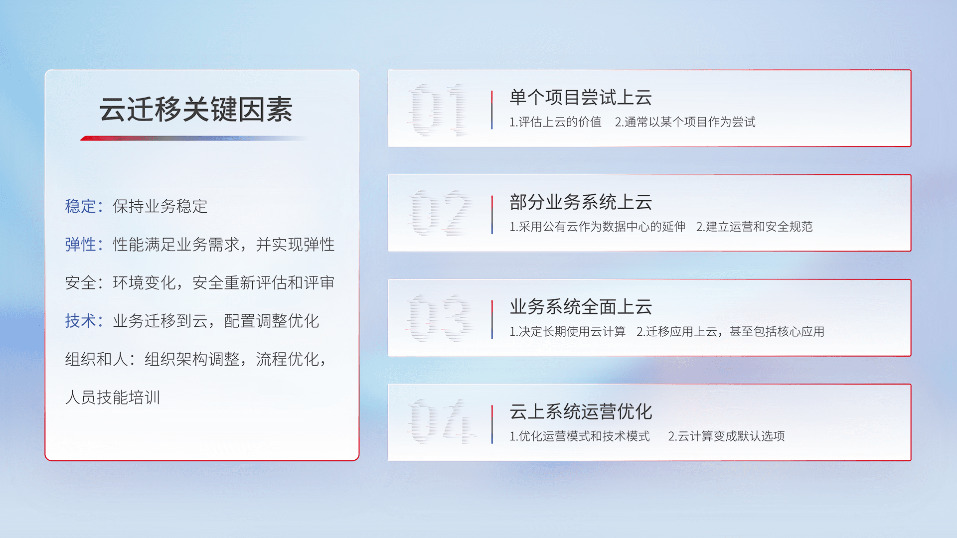 结合实际业务,,,从规划设计、、、云平台选型、、、、云原生改造、、、、数据迁移、、集成交付,,,迁移全过程为客户识别最佳上云路径,,做好风险识别管理,,,,设计网络架构、、、、身份权限、、、安全审计合规、、、、操作审计、、、日志审计、、、监控告警策略、、多站点容灾设计等,,,对云上基础设施进行整体规划,,,提升IT治理水平,,,以满足弹性、、、高可用、、、高性能的需求。。。
